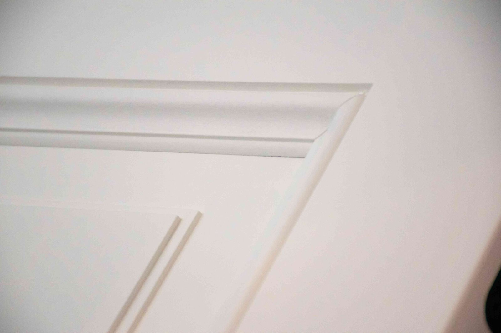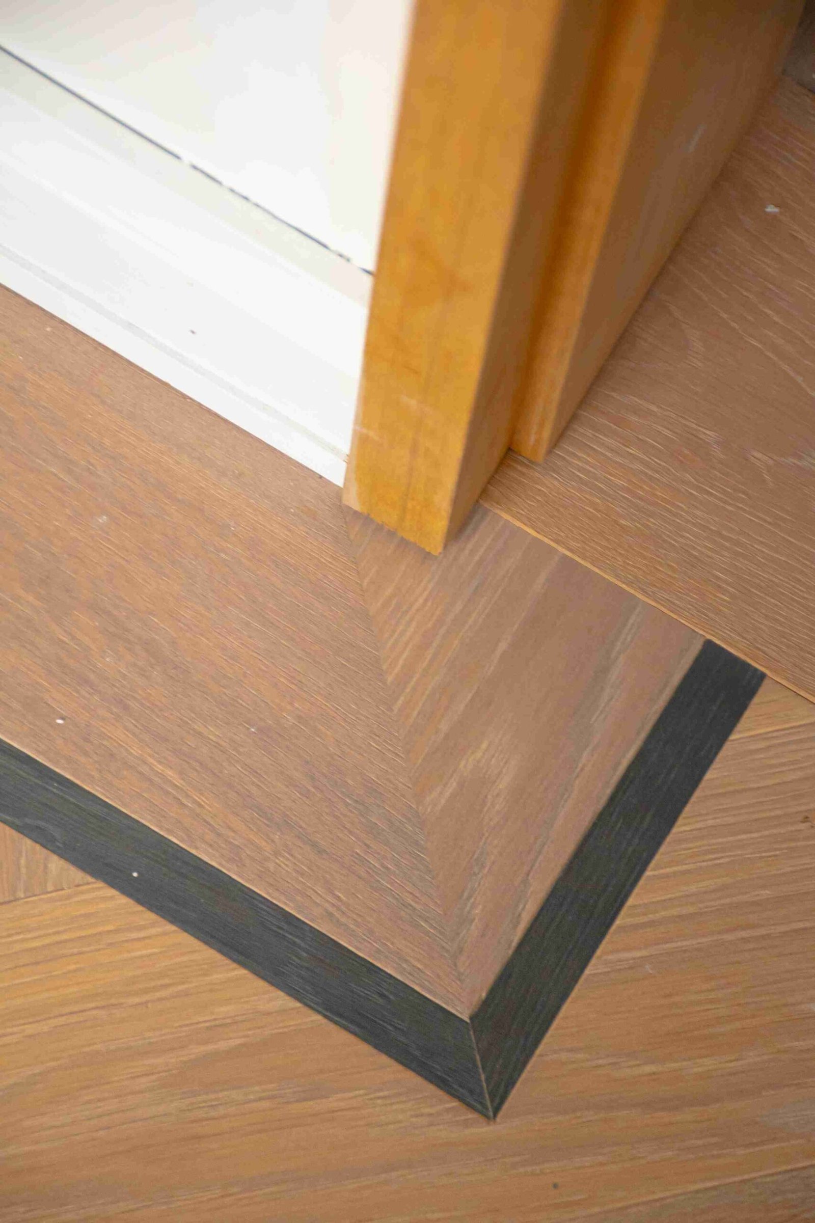 Blokkaderdeur. Hier zie je een klassieke paneeldeur in blokkader die uit de muur komt, zodat de  plint hier tegenaan gewerkt kan worden. Dat deden we, omdat er op enkele plaatsen geen ruimte was voor een plint of omlijsting. Problemen? Wij noemen het uitdagingen!