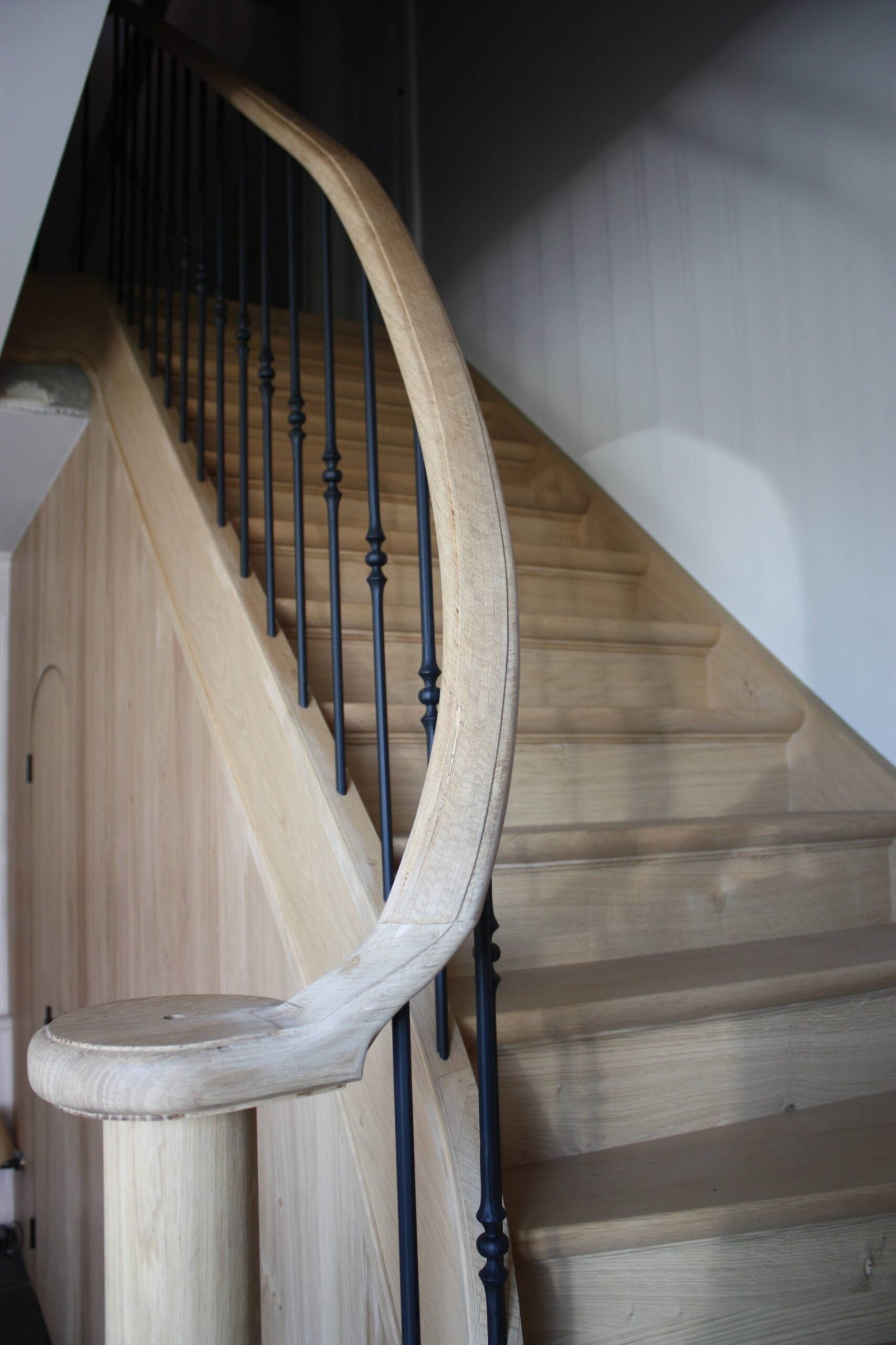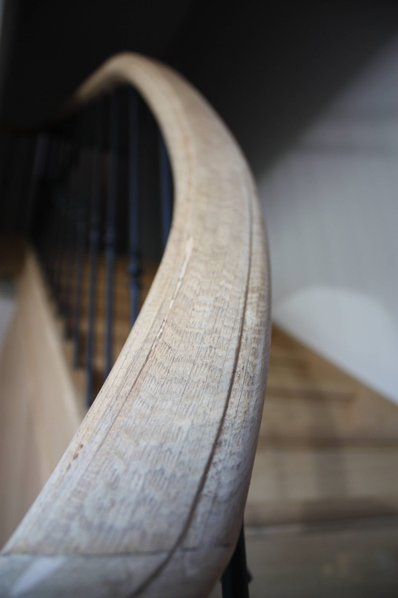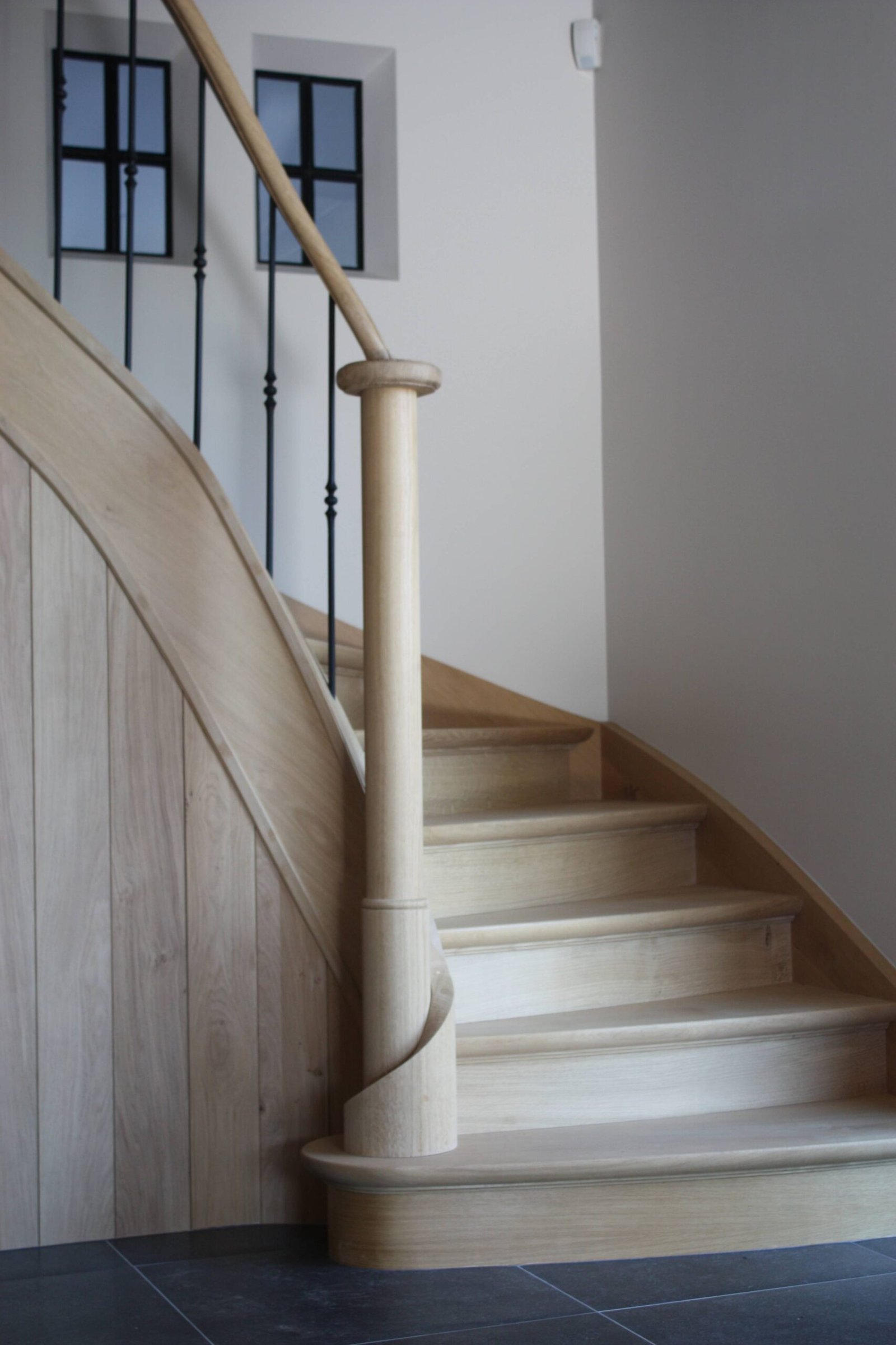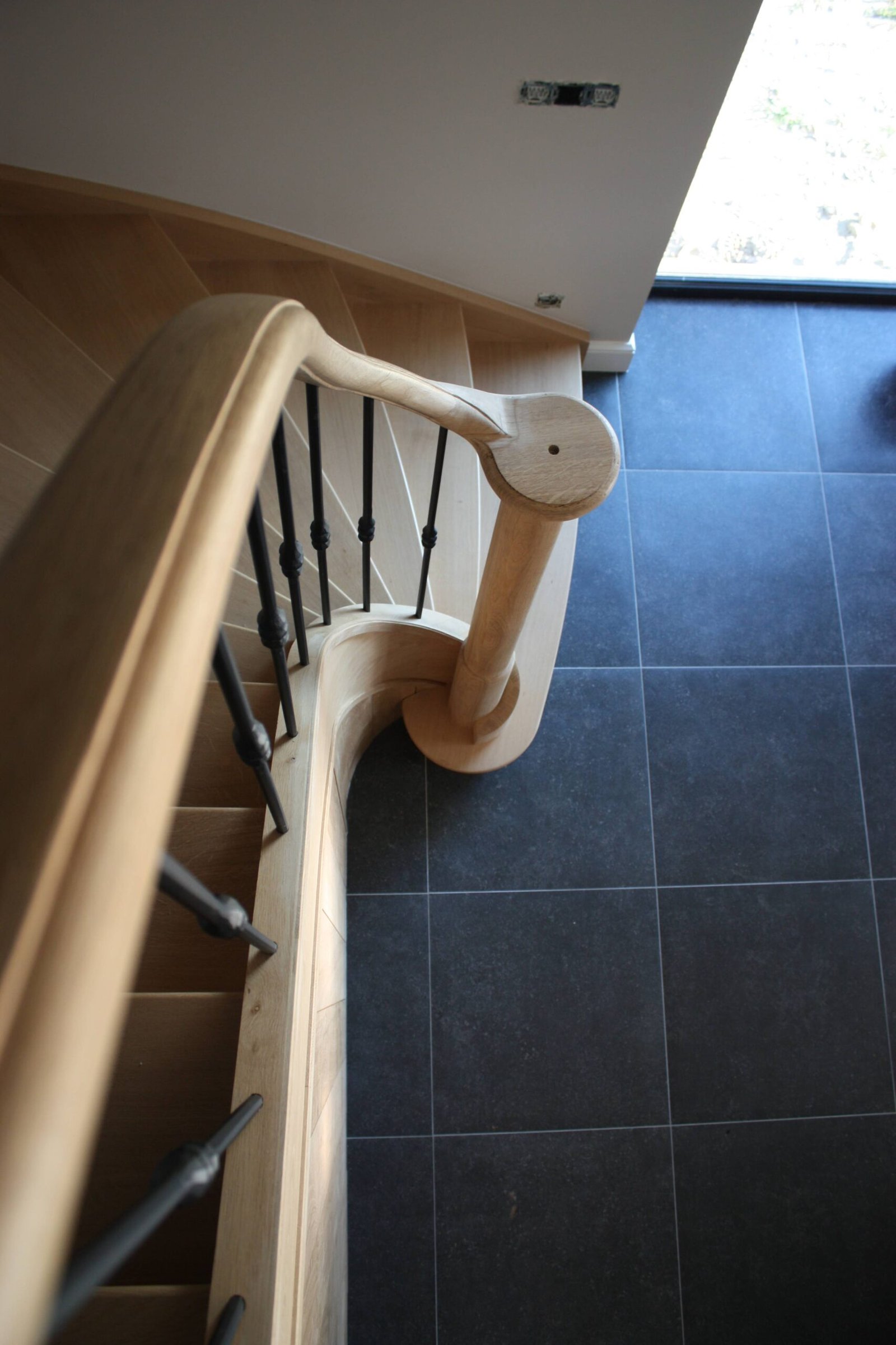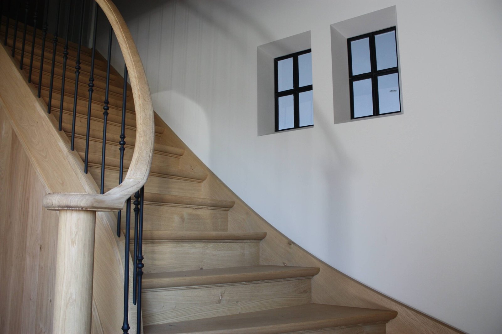 Aan de kwartslagtrap met wrongstuk zie je meteen dat de tweede een echte landelijke trap is. De wand draait zelfs nog verder door rond de gedraaide kolom met klak, waaruit de handgreep vertrekt.